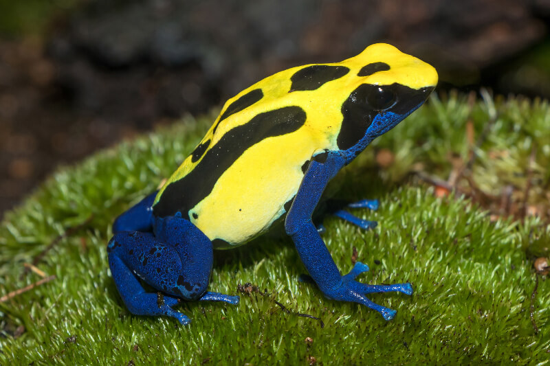La grenouille dendrobate (Dendrobates tinctorius) est l’une des plus célèbres grenouilles tropicales au monde. Originaire des forêts humides d’Amérique du Sud, notamment de Guyane, du Suriname et du Brésil, elle attire immédiatement le regard par ses couleurs éclatantes : bleu, jaune, noir ou turquoise selon les individus. Ces teintes vives ne sont pas qu’esthétiques : dans la nature, elles servent à avertir les prédateurs de leur toxicité.