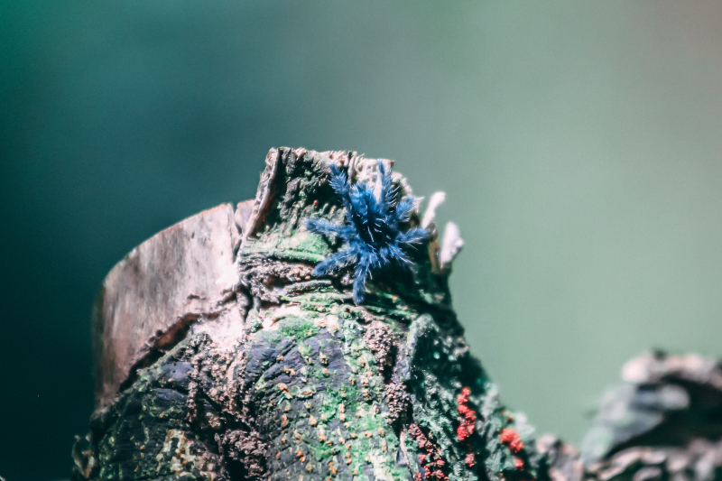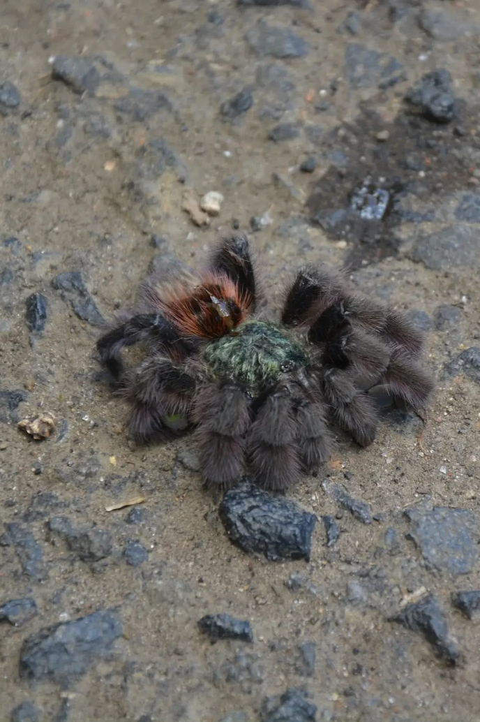 Cette araignée impressionnante peut mesurer jusqu’à 18 cm d’envergure. Le mâle, plus petit, présente des couleurs sombres et discrètes. La femelle affiche des teintes vives allant du bleu électrique au vert irisé, en passant par le roux et le rosé.