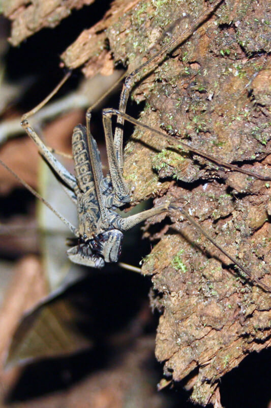 It has a flat body, two long whip-shaped tactile antennae, and large front legs that it uses as radars. Its powerful tweezers allow it to accurately capture insects or small invertebrates. This particular morphology makes it an agile predator and very well adapted to life in tropical undergrowth.