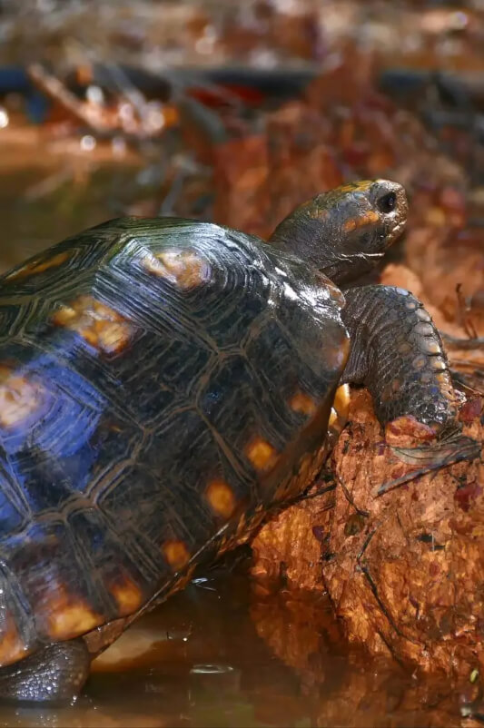 The denticulated turtle (Chelonoidis denticulata) is a large land turtle native to South America and the Lesser Antilles. It owes its name to the small “teeth” visible on the edge of its shell, a characteristic that distinguishes it from the red-legged coal turtle.